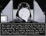 "Got a new helmet today! A better fit than the last, and I don't get so hot and sweaty. Plus, it looks a bit more menacing. Not much time to write. I have to be up early for a meeting tomorrow. I'm sick of meetings. I just want to get out and do some evil. I haven't been well, lots of nitemares..." =>