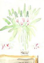 Heb een bos tulpen gekocht in eik & linde. Deze bos al een week, iedere dag, nagetekend met aquarel. Dit is de eerste tekening, toen de bloemen nog in 't groen verscholen waren. Heb tot nutoe, 'n 1 a 2 per dag, dus een 15 tal tekeningen gemaakt. Ze zijn nu over hun hoogte punt heen. Ik geef ze nog wel water, maar ze gaan nu toch echt verwelken. Leuk experiment!